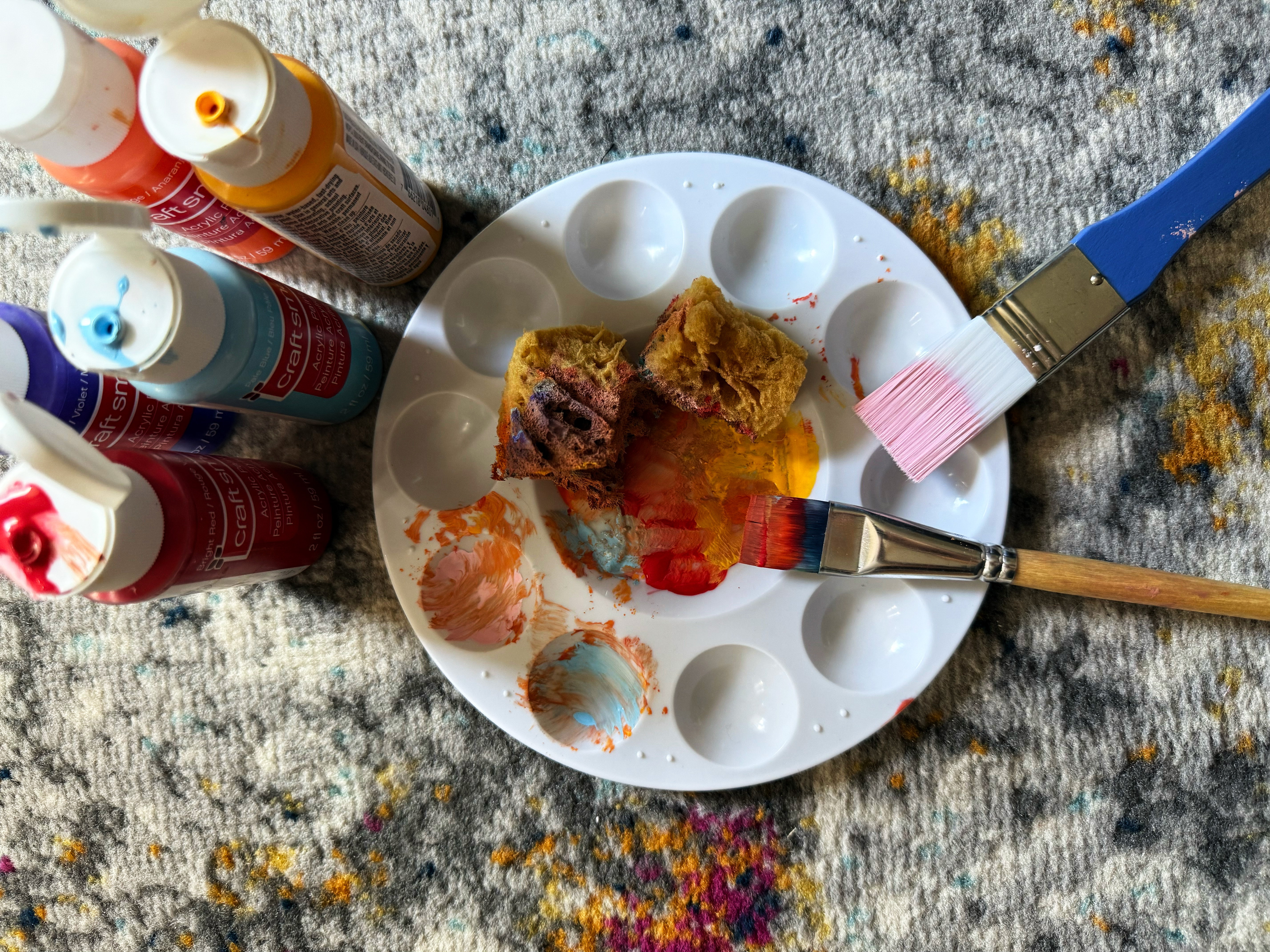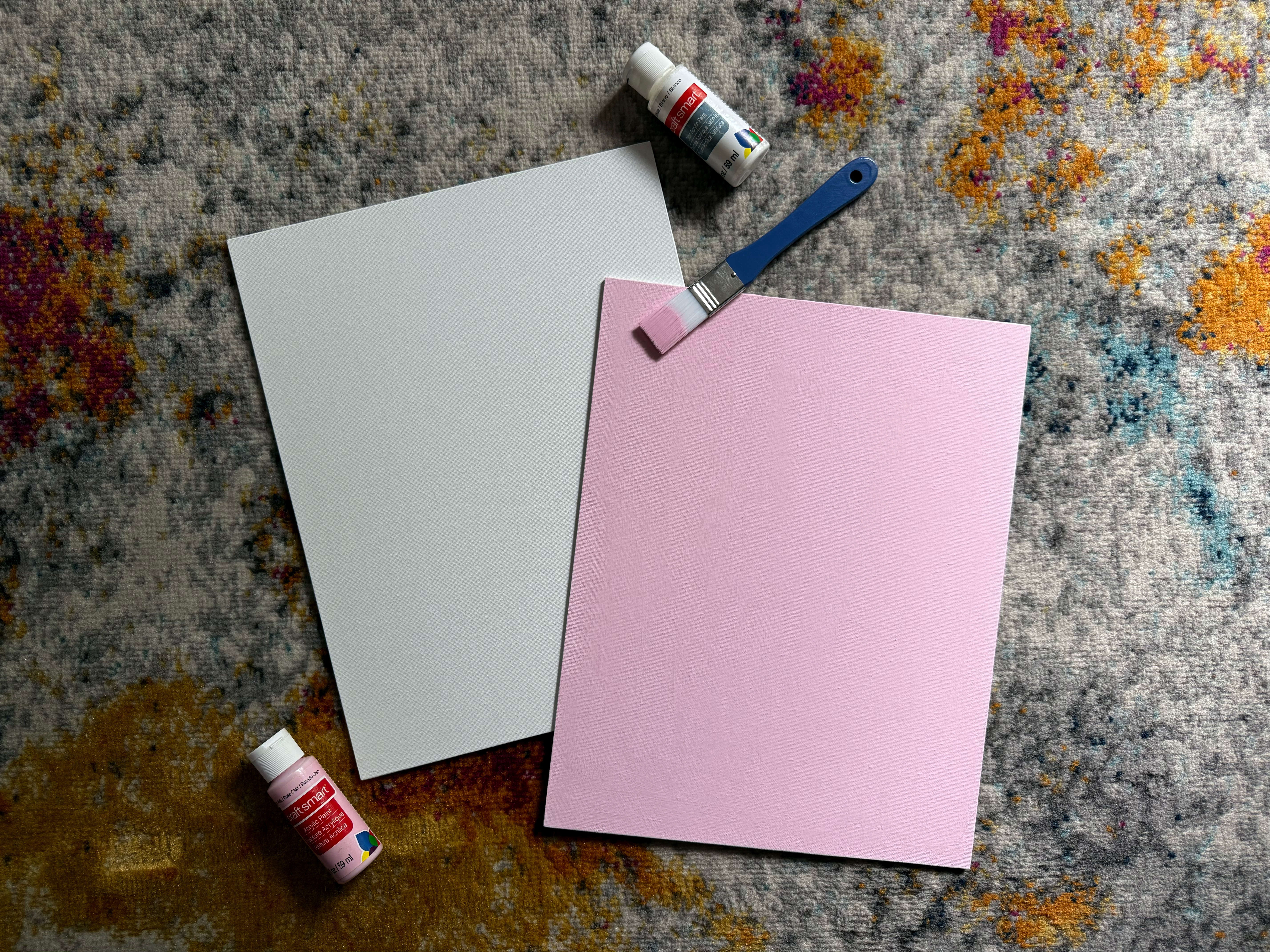 First, I worked on creating a solid base acrylic layer in both white and pink to create variation. Once that was completed, I placed both boards on a white sheet to limit the amount of mess being made and blindfolded myself.