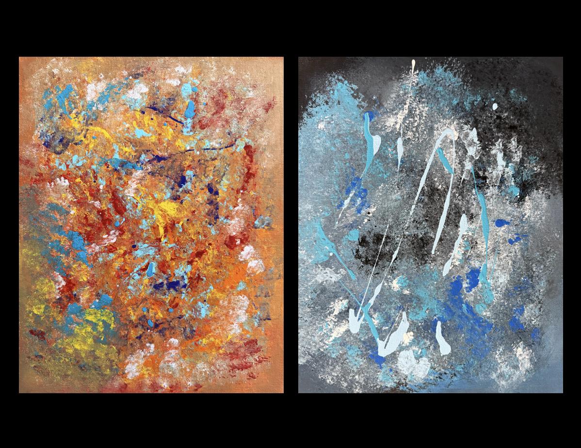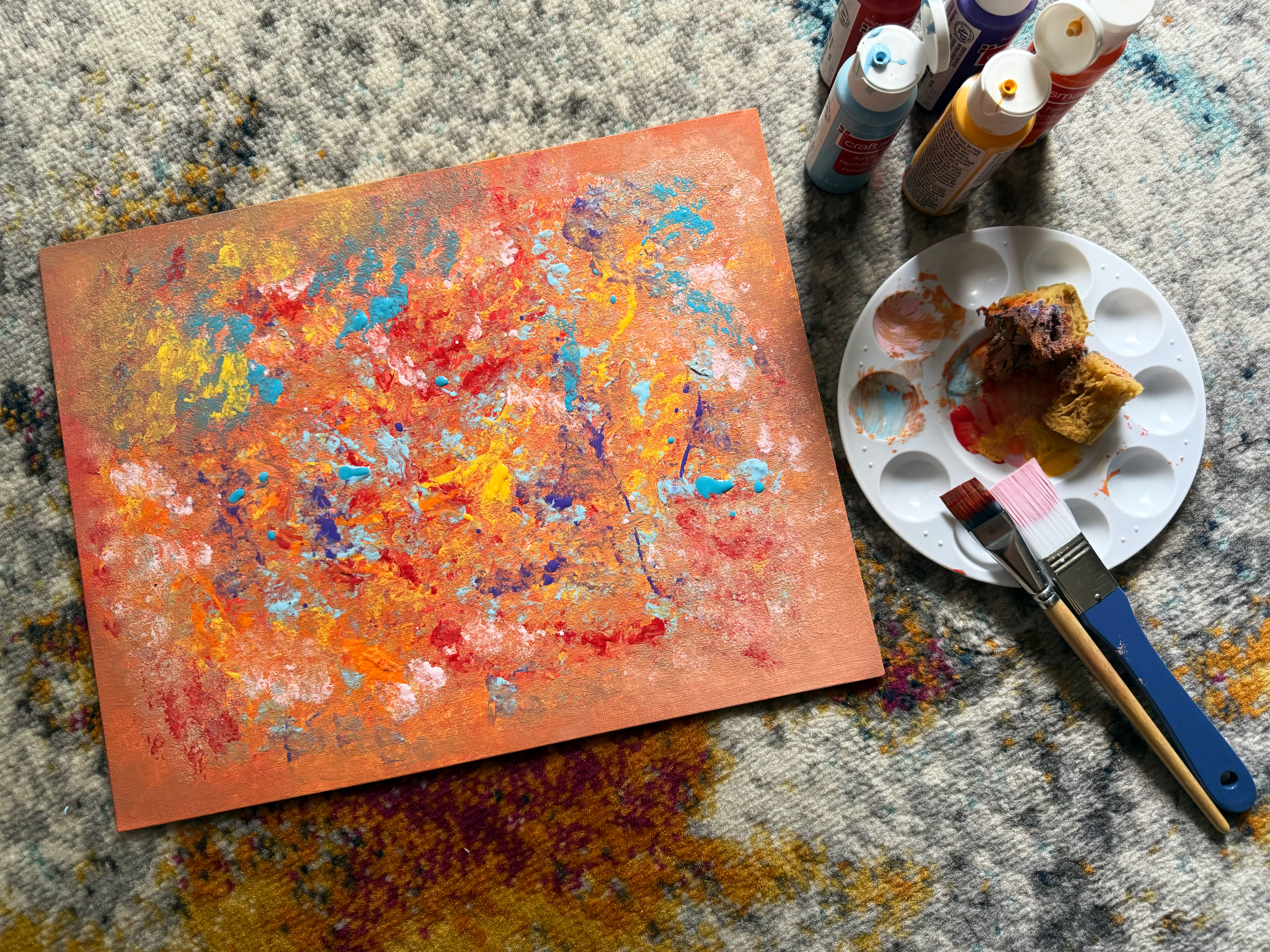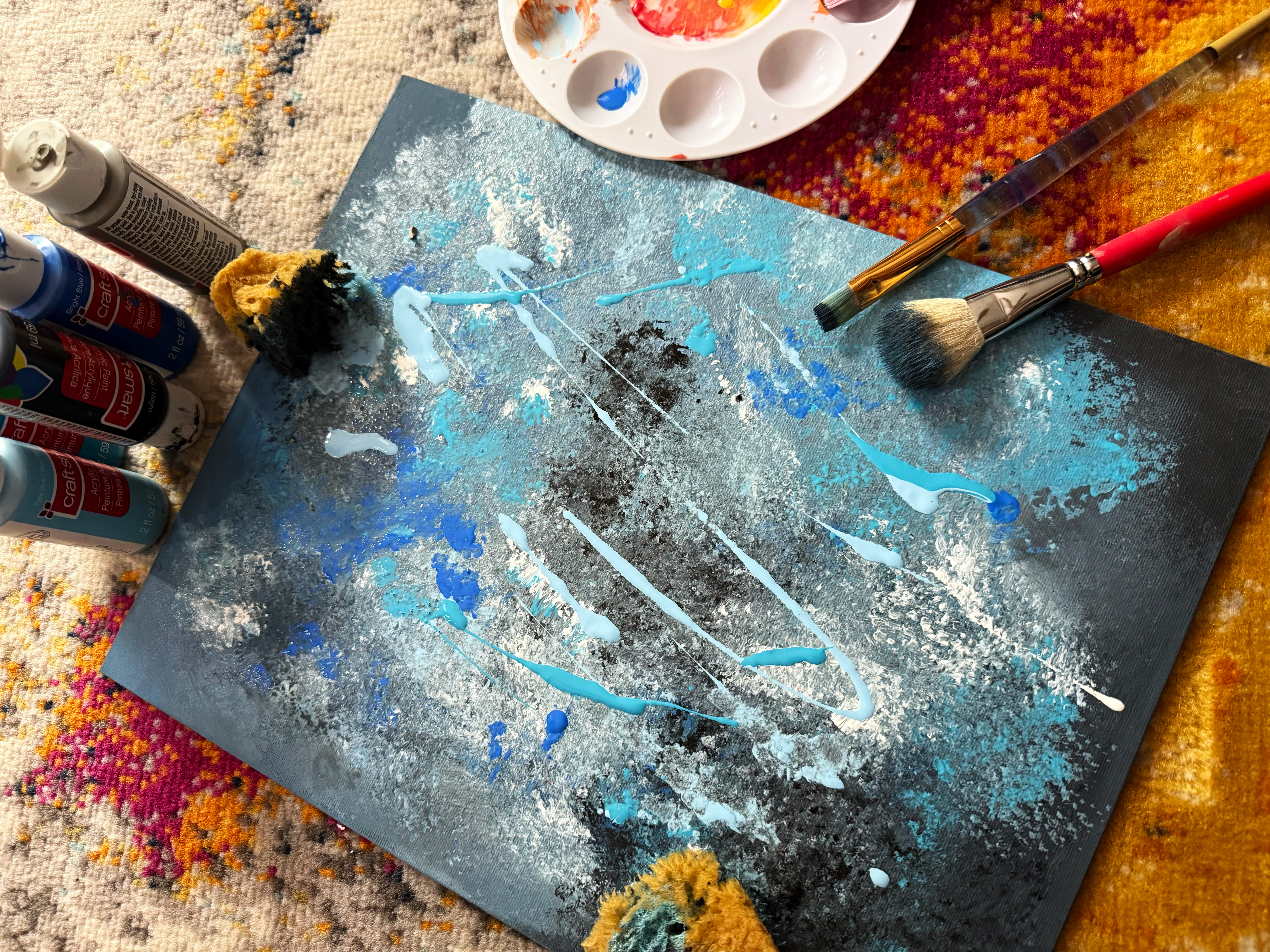 For this project, I’d like to work blindfolded and focus on other sensory capabilities beyond sight in order to visually showcase what life is like when working under the constant state of head pain. The materials utilized are acrylic paints, paint brushes, and canvas.