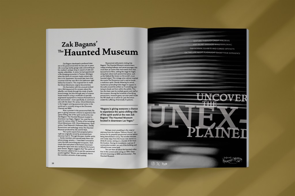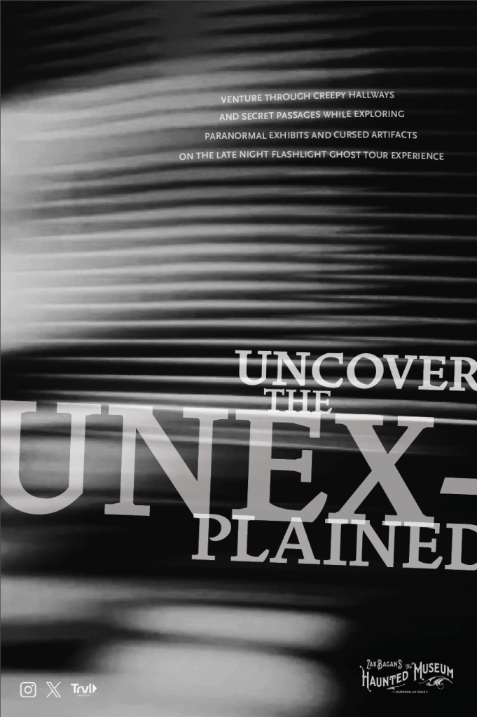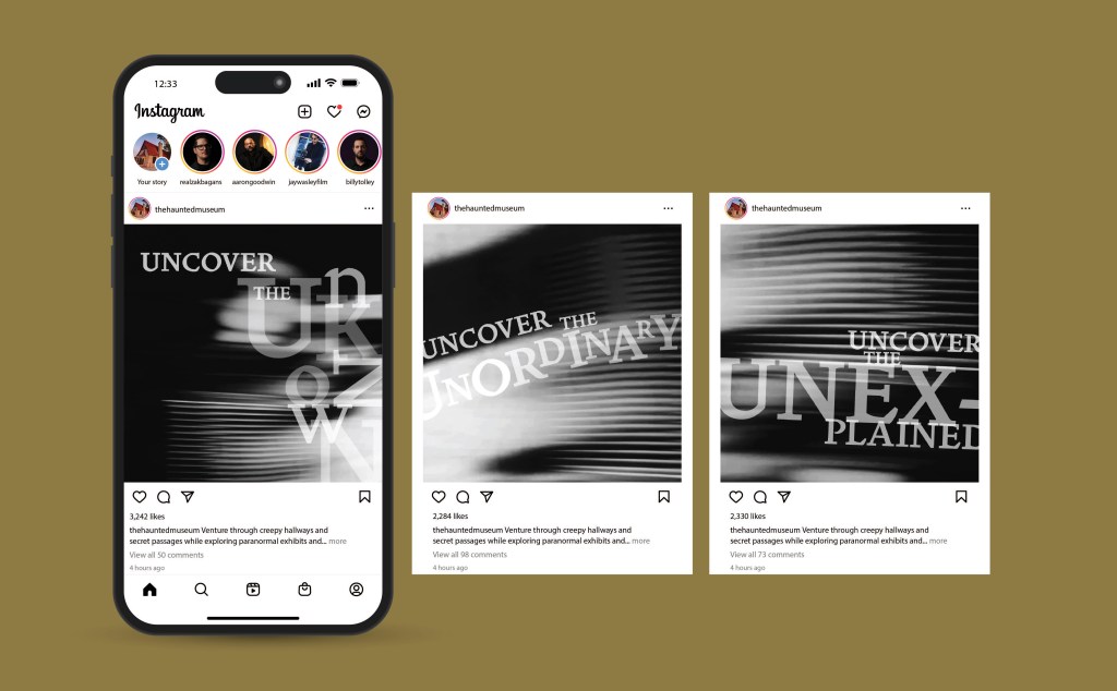 This campaign was inspired by Zak Bagans’ Haunted Museum in Las Vegas, a destination known for its chilling collection of paranormal artifacts, cursed objects, and haunted relics from around the world. As a longtime viewer of Ghost Adventures, I was drawn to the eerie atmosphere and investigative storytelling that define both the show and the museum. That fascination guided my creative direction, influencing the dark, mysterious tone of the visuals and messaging. I chose the call to action—“Uncover the Unknown. Uncover the Unordinary. Uncover the Unexplained.”—to reflect the curiosity and thrill that come with exploring the paranormal, encouraging audiences to take the next step into the unknown.
