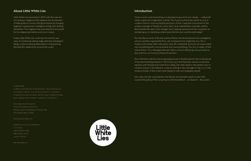 In 2017, Little White Lies published a review on Annabelle: Creation which is the prequel to the 2014 Annabelle, the fourth installment in The Conjuring Universe franchise. This booklet delves into the history behind the creation of The Conjuring Universe: the lives of the investigators, going behind some of their most famous cases, and breaking down some of the key points within the movie adaptations.